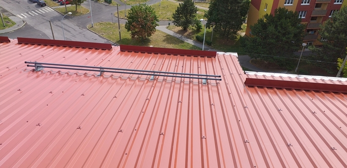 Velký důraz je kladen na bezpečnostní opatření, a proto standardně montujeme nejenom trojúhelníkové sněhové zachytávače nad okapovým žlabem, ale také tyčové zachytávače nad vchody do objektu. Střecha je rovněž osazena bezpečnostními kotevními body pro bezpečný pohyb osob po střešní krytině.