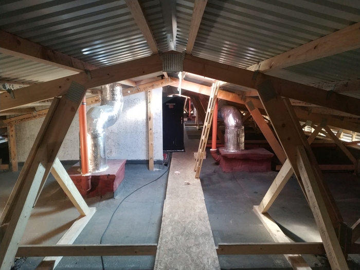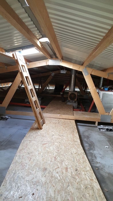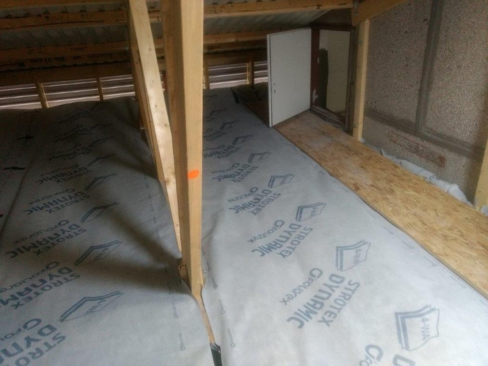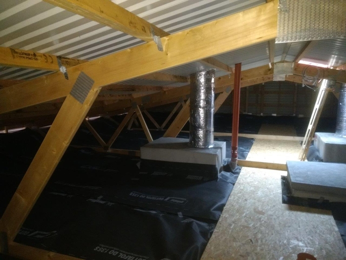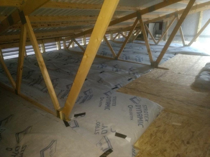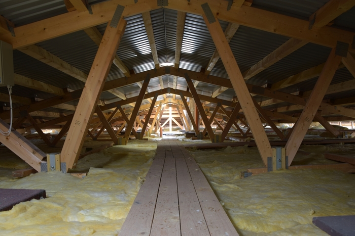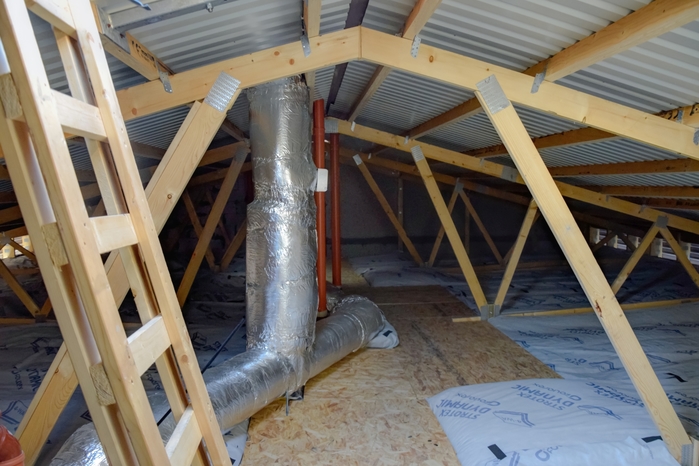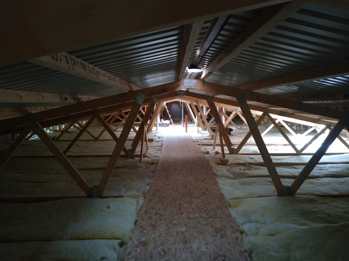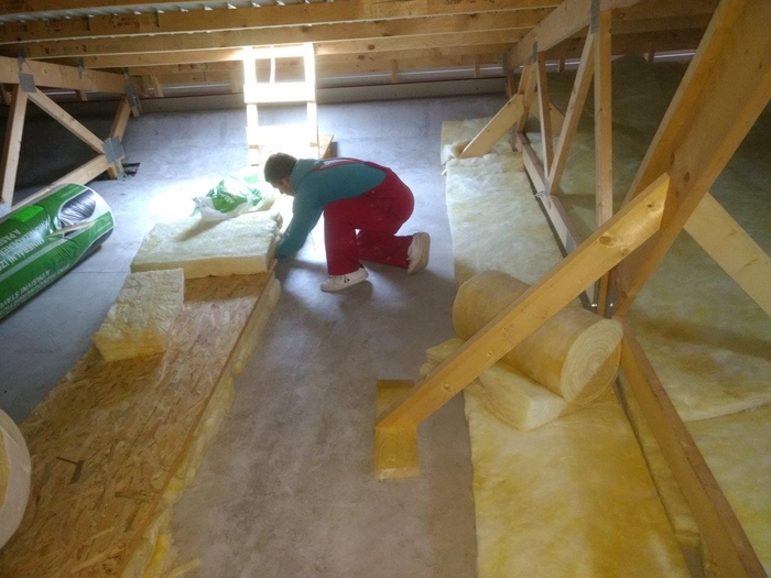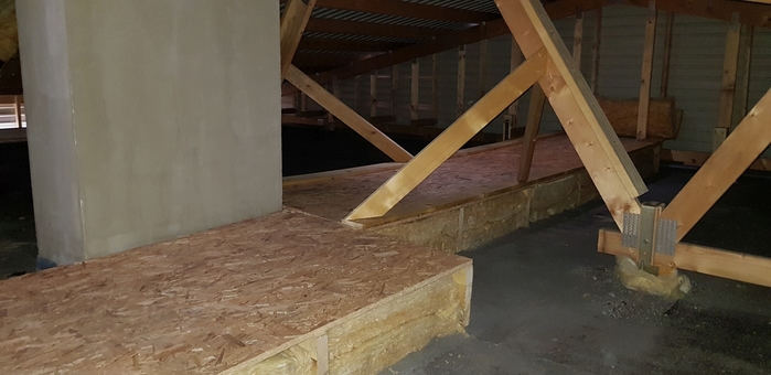 Zateplení půdního prostoru lze provést již v průběhu rekonstrukce střechy, což také z hlediska stavebních prací a nižších nákladů doporučujeme. V případě nedostatku financí je možné zateplení provádět dodatečně (jedna z výhod systému RpSt), popř. zvětšit tloušťku izolační vrstvy. Tepelnou izolaci z minerální vaty klademe na stávající střešní vrstvy. Pro zachování snadného průchodu pod konstrukcí střechy je středem zhotovena dřevěná pochůzí lávka z OSB desek v šířce 1250 mm (popř. 600 mm), čímž se také zabrání poškození tepelné izolace při pohybu v půdním prostoru.